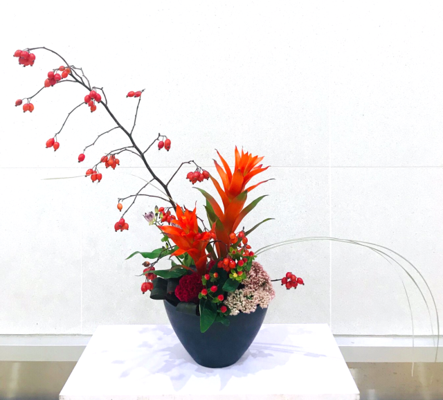 たわわに実った鈴バラ、紅葉色のアナナスで少しエキゾチックな秋のアレンジと